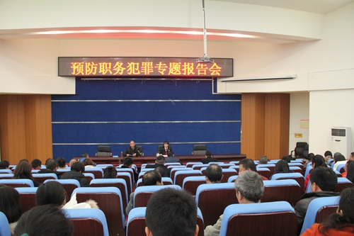 下午,都江堰市人民法院赵金蓉庭长在学院学术厅作了预防职务犯罪专题报告会,学院领导班子成员、中层干部、副高职称以上教师、全体党员参加了报告会。报告会由学院党委副书记、纪委书记黄天贵同志主持。