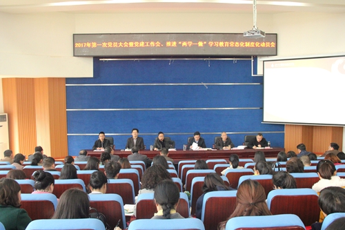 下午,学校在学术厅召开2017年第一次党员大会暨党建工作会、推进“两学一做”学习教育常态化制度化动员会。全体校领导、全体中层以上干部、全体党员、离退休党员代表、全体专兼职辅导员、学生党员参加会议。会议由院长、党委副书记李春明同志主持。