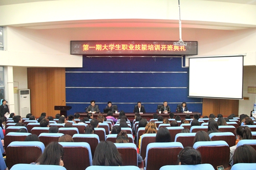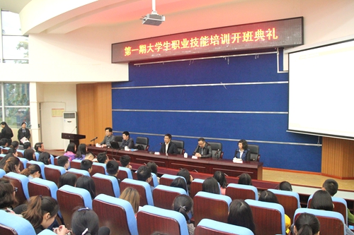 晚,由四川省人力资源和社会保障厅、四川省教育厅联合主办,我校承办的第一期大学生职业技能培训班开班典礼在学术报告厅举行。四川省人力资源和社会保障厅就业促进处副处长曾志刚、四川省教育厅学生处副处长吕刚、树才职业技能培训学校校长丁瑞宇、我校李春明院长、岳文喜副院长、对外交流合作处和党政办相关工作人员、本次培训班的班主任以及参加培训的300余位学员代表参加了开班典礼。