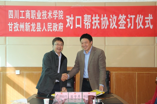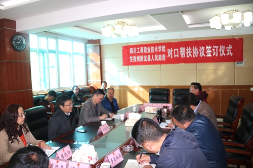 ,我校与新龙县人民政府在新龙县人民政府会议室举行对口帮扶协议书签字仪式。县委副书记、县长董德洪,县委副书记泽扎、常务副县长文万春、副县长多吉格西以及县委办、政府办、县发改局(援藏办)、住建局、农牧科技局、文旅广影局、扶贫移民局、博美乡等部门负责人出席签字仪式。县委副书记、县长董德洪在讲话中指出,四川工商职院办学条件好,师资力量强,社会声誉高,用心用情对口帮扶新龙县,并选派刘彦廷进村进户真情帮扶。在学校经费紧张的情况下,对口帮扶德麦巴村17户,援建村幼儿园、博美乡党员活动室,帮助培养县上基层干部,负责旅游扶贫总体规划,还将为县上搭建电商平台,县委、县政府和广大群众对四川工商职院表示衷心感谢。李春明院长在讲话中指出,我校党委行政高度重视新龙县扶贫工作,把精准扶贫摆在学校工作重要位置,列入目标管理,学校将进一步发挥智力优势,做规划、搞培训,加大对新龙县的宣传,助推新龙县经济社会发展。
