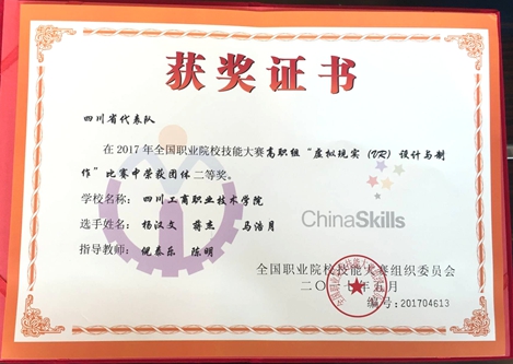 在日前落幕的2017年全国职业院校技能大赛虚拟现实(VR)设计与制作赛上,经过六个小时紧张激烈的角逐,由我校倪泰乐、陈明老师指导的设计艺术系与信息工程系学生杨汉文、蒋杰、马浩月共同组建的四川省一队荣获国家级二等奖,也是我省唯一获得此项赛事的队伍。
