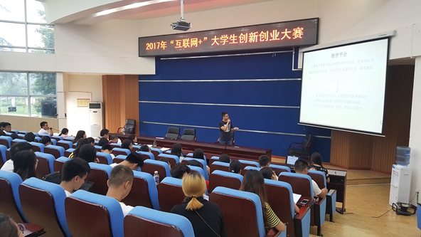 ,由学校党委学工部主办的“四川工商职业技术学院2017年‘互联网+’创新创业大赛”在学术报告厅举行。经过学校专家评委对全院各系提交的150余个创新创业项目进行评比和筛选,共有45个项目进入最终的比赛。最终的比赛共分为项目展示和答辩两个环节。每个环节有5分钟的时间供参赛选手把自己的项目展示给评委和在场的观众。比赛过程中,各个项目的负责人都拿出了百分之百的热情来向众人展示自己的创业项目,比赛现场气氛十分活跃。经过近一天的比拼,大赛最终评选出16个项目进入集训营。