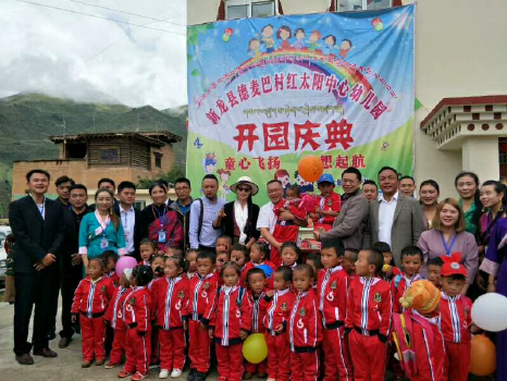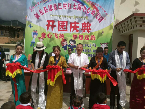 之后,新龙县委领导和学院领导共同为德麦巴村红太阳中心幼儿园的开园进行剪彩揭牌。