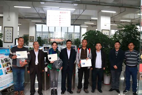 学校领导和嘉宾为参加首届职工摄影比赛获奖作品作者颁了奖。