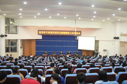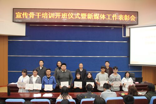 在全国上下宣传贯彻党的十九大精神和习近平新时代中国特色社会主义思想,以及深入落实全国、省思想政治工作会议精神之际,11月14日晚,我校宣传骨干培训班开班仪式暨新媒体工作表彰会在校学术厅举行。党委副书记黄天贵、党委宣传部、校团委负责人出席会议。党委宣传部新媒体工作室及团委青年传媒中心全体成员,校团委、校学生会、系团总支、系学生会全体成员,各班宣传委员共计300余人参加会议。