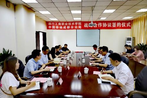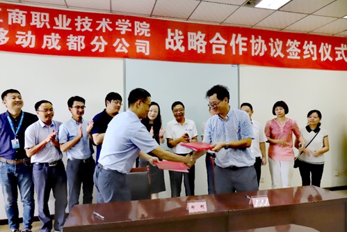 在李春明院长和牛怡总经理的见证下,我校岳文喜副院长和中国移动成都分公司都江堰总经理郑刚共同签署全面信息化战略合作协议。