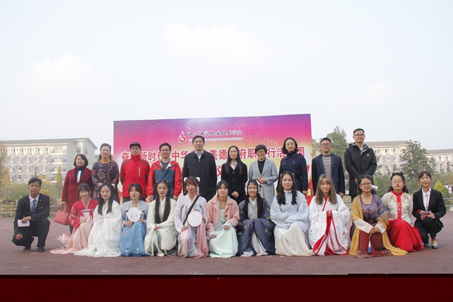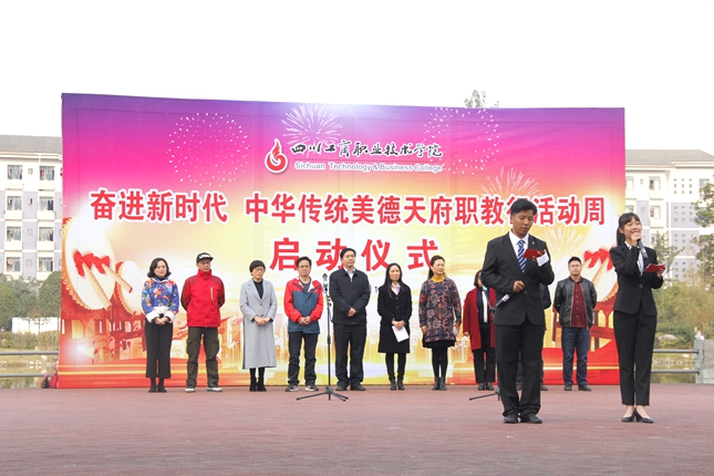 为深入学习贯彻习近平新时代中国特色社会主义思想和党的十九大精神,将中华优秀传统文化与职业教育有机融合,按照全国职业院校“奋进新时代 中华传统美德职教行”全国性活动组委会活动方案的部署,我校“奋进新时代 中华传统美德天府职教行”活动启动仪式于11月12日在我校无镜湖广场举行。学校党委书记管永林、纪委书记向晓岚及团委和各系党总支负责人出席启动仪式,学校辅导员和学生代表参加活动。