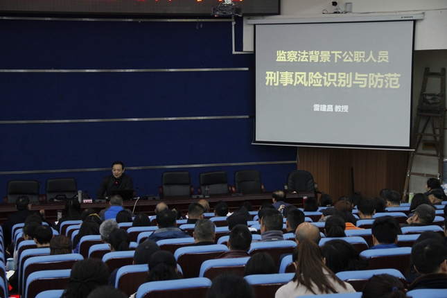 雷建昌教授以“预防职务犯罪”为题,结合十八大以来反腐败格局的变化和监察委成立后的新形势新任务新要求,围绕职务犯罪“风险有多大、为何有风险、风险在哪里、风险如何防”四个方面为学校师生作了一堂内涵丰富、发人深思、普法与防范相结合的专题讲座,雷教授结合其多年执法工作中的办案经历,剖析生动鲜活的案例,多层次、多视角深入浅出阐述了反腐倡廉是我们每个人的事情,是事关自身、家庭和单位发展的大事,告诫大家要保持清醒头脑和法纪意识,认清当下反腐形势,抵御住诱惑,坚守底线,要时刻不忘纪律规矩,筑牢拒腐防变思想防线。