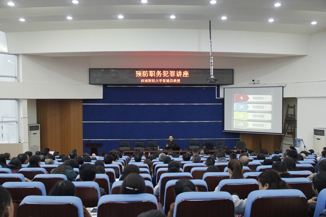 为进一步推动全面从严治党向纵深发展,持续加强学校党风廉政建设,在学校党风廉政教育宣传月活动中,继组织党员干部参观郫都区廉政文化展、赴雅安监狱开展警示教育之后,11月15日,学校邀请西南财大法学院教授、硕士生导师雷建昌在学术报告厅做了预防职务犯罪专题讲座。学校中层以上干部、全校共产党员、基建、财务、资产、总务等部门人员、系部教研室主任、科研创新团队负责人、学生党员200余人聆听了讲座。讲座由党委书记管永林主持。