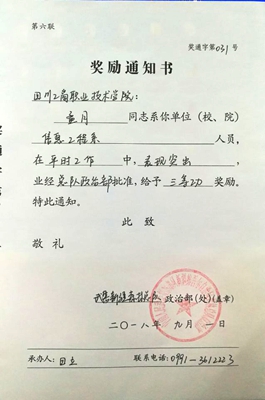 2018年11月28日,我校收到武警新疆森林总队寄来的立功奖励通知:我校原2014级电商14323班学生孟月因平时工作中表现突出,被新疆森林总队政治部荣记三等功。