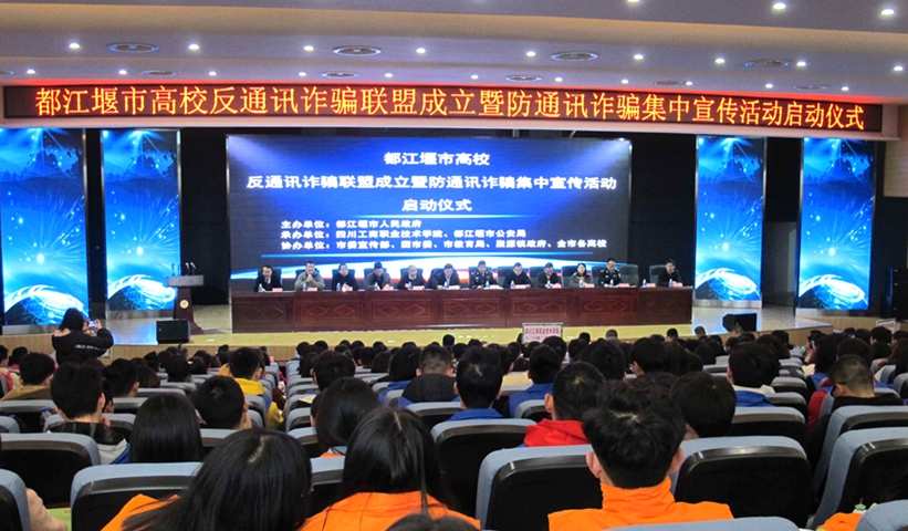 3月13日下午,由都江堰市人民政府主办,都江堰市委宣传部、团市委、市教育局、聚源镇政府、都江堰市各高校协办,我校和都江堰市公安局承办的都江堰市高校反通讯诈骗联盟成立大会暨防通讯诈骗集中宣传月启动仪式在我校举行。都江堰市副市长、市公安局局长达军,我校党委书记管永林、党委副书记黄天贵、副院长邓春生,四川农业大学都江堰校区副校长何国柱,四川外国语大学成都学院校长助理沈光临,成都东软学院党委副书记、副院长张宪民,四川水利职业技术学院副院长胡恒,市级相关部门及乡镇相关负责人出席启动仪式,五所驻市高校学生代表参加活动。
