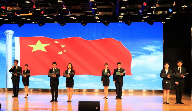 表彰大会在庄严雄壮的国歌声中拉开帷幕,首先,来自青年传媒中心的同学们代表青年团员向大会献辞,他们激情而饱满的声音感染着在场的每一位,以热情洋溢的献辞为五四青年节献上了一份特殊的礼物。随后,大会举行了新团员入团宣誓仪式。现场观众席在座的各位团员同志也一同起身,面对鲜红的团旗,高举右拳,在领誓人李倩老师的带领下,重温了入团誓词,再一次接受了共青团思想的洗礼。