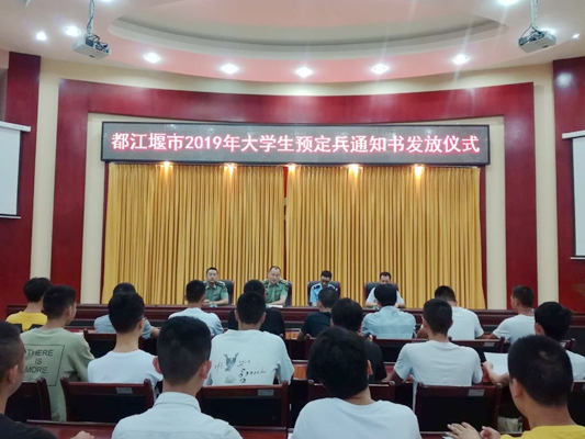 6月25日,都江堰市人民武装部王部长、军事科吕参谋、郑科长,市公安局罗警官一行,到校开展2019年都江堰市大学生预定兵通知书发放仪式。学校武装部负责人吴勇主持仪式,我校56名预定兵代表参加,仪式现场郑科长就大学生的基本政治审查及相关的大学生入伍政策进行了一一解答。