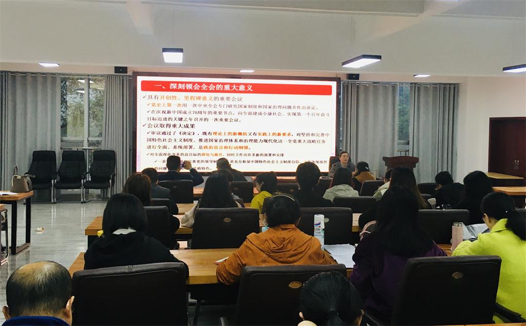 党的十九届四中全会闭幕后,我校立即行动起来,结合“不忘初心、牢记使命”主题教育,把学习全会精神作为当前的一项重要工作抓紧抓实,认真组织开展了各种形式的学习活动,力争学深学透全会精神,为我校高发展注入新的活力。