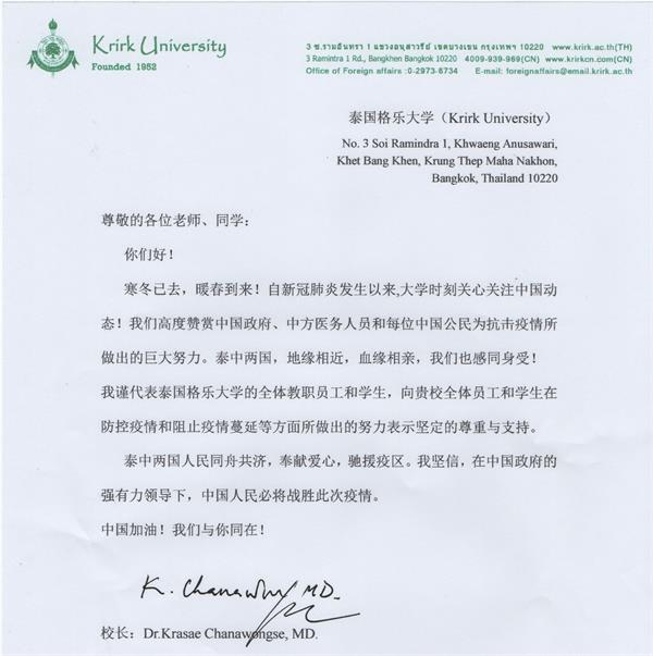 泰国格乐大学校长杨金泉先生也代表格乐大学的全体教职工和学生向我校发来慰问信,对我校在防疫和抗疫方面做出的努力表示尊重与支持。