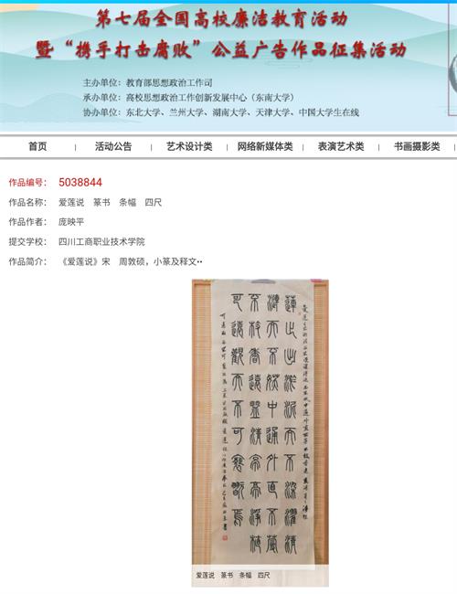 由中国教育部思政司主办的第七届全国高校廉政教育暨“携手打击腐败”公益广告项目征集活动日前结果公示,我校设计艺术系庞映平研究员创作的4尺篆书书法《爱莲说》成功入选。