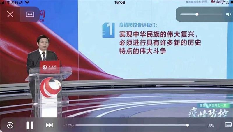 3月9日下午,根据教育部和四川省委教育工委的统一安排部署,我校近万名师生通过网络直播同步在线收看“全国大学生同上一堂疫情防控思政大课”。自通知下发后,学校党委高度重视,积极响应,学校党委宣传部、思政部、教务处、学生工作处进行了组织安排。为了加强学生的学习效果,思政课教师还将在课堂上对学生进行交流答疑,因有课没有看直播的同学还将按要求收看回放。