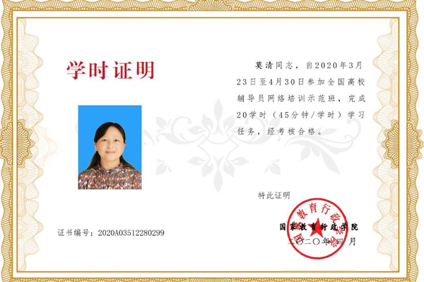 为深入贯彻落实习近平总书记系列重要指示精神和党中央决策部署,统筹推进当前疫情防控和学生思想政治教育工作,根据教育部思政司《关于举办全国高校辅导员网络培训示范班的通知》文件精神,3月底,我校学生工作处组织29名从事学生管理工作辅导员教师报名参加了此次全国高校辅导员网络培训示范班学习。今日我校29名参培教师均以满分的成绩全部顺利结业,取得了培训合格电子证明。