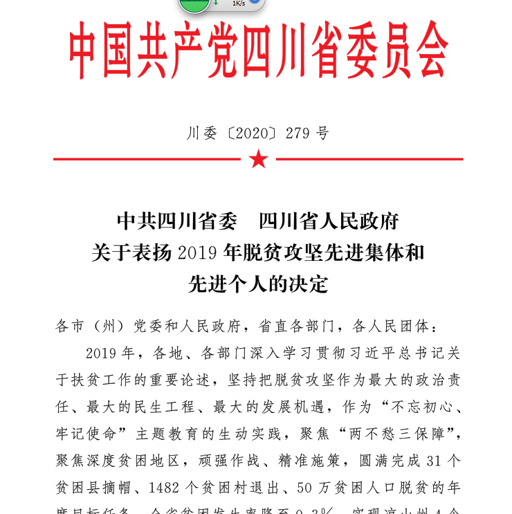 2020年5月18日,四川省委、省政府发布《中共四川省委 四川省人民政府关于表扬2019年脱贫攻坚先进集体和先进个人的决定》(川委〔2020〕279号),为激励各地、各部门和广大党员干部以更大决心、更强力度决战决胜脱贫攻坚,省委、省政府决定对在2019年度脱贫攻坚工作中做出优异成绩的集体和个人予以表扬,我校被评为“全省脱贫攻坚定点扶贫先进省直单位”。我校学生工作处处长助理、丹巴县边耳乡日卡村驻村工作队队员徐敏来被评为“全省脱贫攻坚优秀驻村工作队队员”。