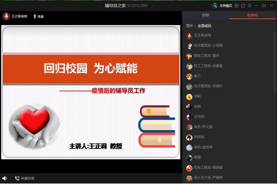 5月22日,我校心理健康教育中心联合学生处对全体专兼职辅导员开展以“回归校园 为心赋能——疫情后的辅导员工作”为主题的线上培训讲座。在酣畅淋漓的运动暖身活动后,本次讲座的主讲人王正莉教授通过分析复学后学生的心理特点,强调疫情后主题班会的重要作用,并且运用实例引导辅导员怎样开展疫情后的第一次主题班会,帮助学生实现轻松复学。同时,进一步强调当学生出现心理危机时,作为辅导员应该怎样及时发现、怎样恰当理解、怎样适度反应,有效助力辅导员开展学生返校后的心理疏导工作。