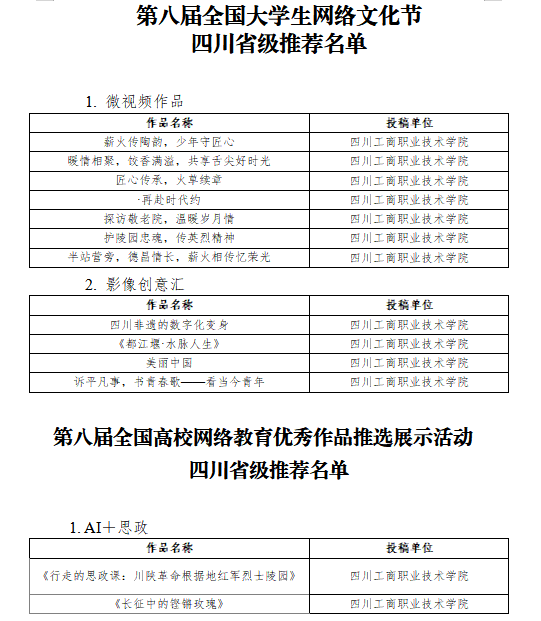 按照《中共四川省委教育工作委员会、中共四川省委网络安全和信息化委员会办公室关于举办第八届四川大学生网络文化节和四川高校网络教育优秀作品推选展示活动的通知》安排,经个人申报、学校推荐、专家评审,近日推荐857件四川大学生网络文化作品、182件四川高校网络教育作品参评“第八届全国大学生网络文化节和全国高校网络教育优秀作品推选展示活动”。在党委宣传部的牵头组织下,我院共有《美丽中国》《长征中的铿锵玫瑰》《护陵园忠魂,传英烈精神》等13个作品入围省级推荐的作品名单,将代表四川省参加全国大学生网络文化节和全国高校网络教育优秀作品的推选展示活动,创造了参加此项活动的最好成绩。