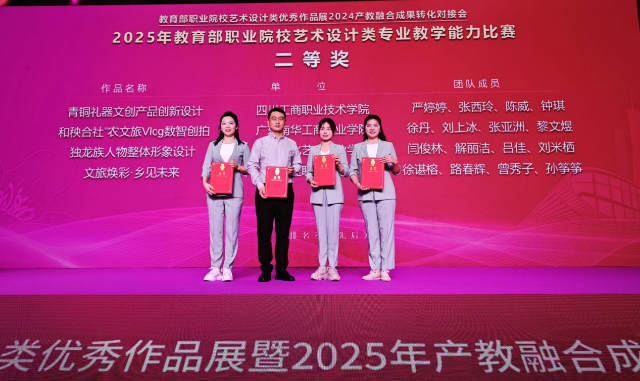 11月16日,2025年教育部职业院校艺术设计类专业教学能力比赛颁奖典礼在广州举行。我院由设计艺术学院严婷婷、张西玲、陈威、钟琪四名教师组建的参赛团队,凭借精心打磨的《青铜礼器文创产品创新设计》作品,从全国47支顶尖参赛队伍中脱颖而出,荣获全国二等奖。