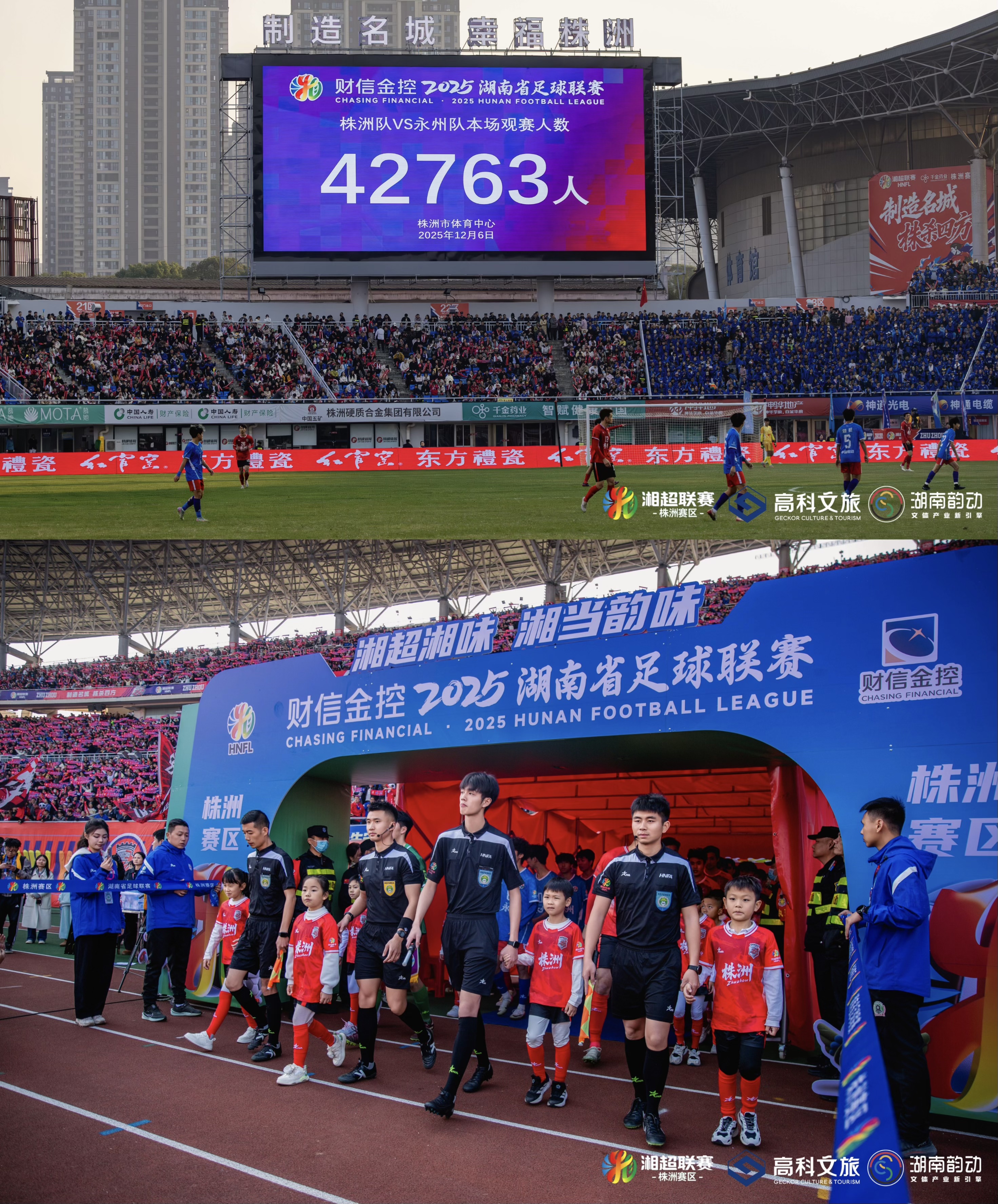 谢家琦老师不仅在全国赛场积极参与社会服务等执裁工作,今年还受湖南省足球协会邀请,担任2025湖南省足球联赛(简称“湘超”)裁判员,以主裁判的职务身份多次执裁“湘超”比赛。在12月6日常规赛最后一轮株洲与永州的关键排位战中,现场有42763名观众到场观赛。在高关注度、高影响力的社会足球赛事下,谢家琦老师出色地完成执裁任务,受到参赛队伍和观众的广泛赞誉。