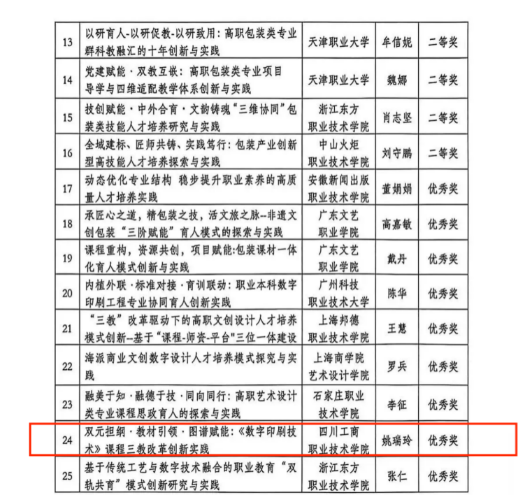 本次获奖的项目,紧紧围绕印刷包装行业技术发展与人才培养需求,深入探索教育教学模式创新与实践路径优化,以可复制、可推广的典型经验为成果,为印刷包装职业教育高质量发展提供了有益借鉴,充分展示了我院多年以来在课程体系构建、教学方法改革、产教融合推进等方面取得的显著成效。
