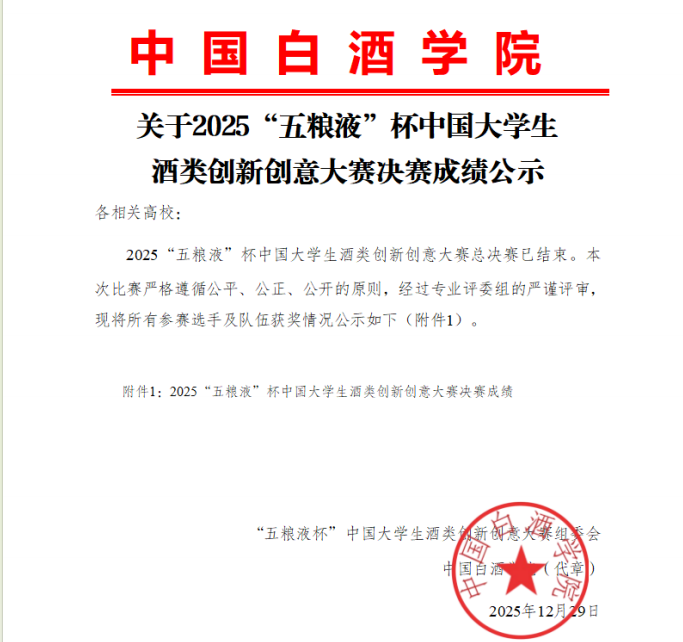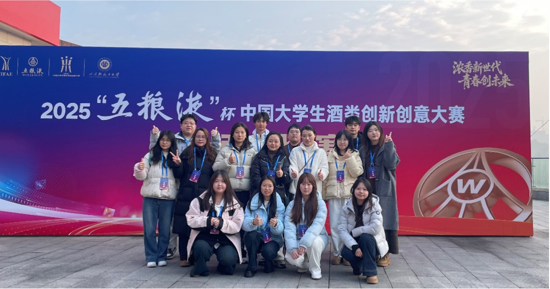 2025年12月16日至17日,由中国酒业协会全程指导的2025年“五粮液杯”中国酒类创新创意大赛在四川轻化工大学中国白酒学院成功举办。我院轻工工程学院选派酿酒技术专业的8名学生,在吴霞、史学琴两位教师的带队下,参与品酒赛道的激烈角逐。同学们凭借扎实的专业知识、敏锐的感官品评能力和稳定的现场发挥,取得优异成绩。其中,张崇一同学荣获大赛一等奖,李欣语等7名同学分获二、三等奖。