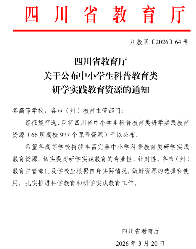 近日,四川省教育厅发布了《关于公布中小学生科普教育类研学实践教育资源的通知》(川教函〔2026〕64号),我院9门课程资源成功入选四川省中小学生科普教育类研学实践教育资源。