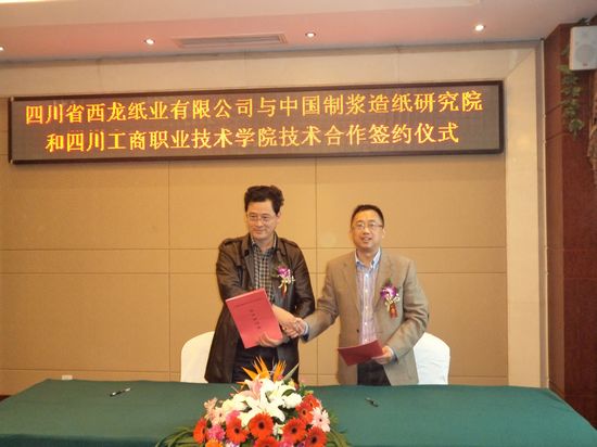 11月1日,我院与四川省西龙纸业有限公司“竹浆白泥资源化利用项目”的技术合作协议在眉山市青神县青神大酒店签约,同时签约的还有该公司与中国制浆造纸研究院的“竹纤维深加工及本色生活用纸研究项目”,岳文喜副院长、周骏总裁分别代表双方在技术合作协议上签字。出席这次签约仪式的还有青神县县长和经信局、科技局的领导。