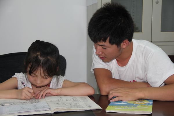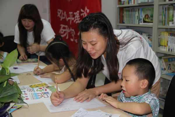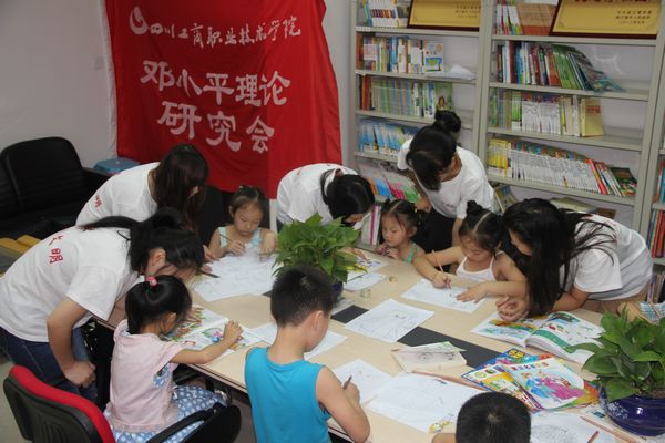 “你的这道数学题应该首先找一下这几个数字的规律……”“小朋友苹果可不能画的太圆啦……”, 7月12日上午,在都江堰市幸福镇民丰社区志愿者服务站里俨然成了一个大课堂,学院邓研会暑期“三下乡”社会实践服务队开办 “阳光课堂”正在授课,来自四川工商职院的大哥哥、大姐姐们不仅为放暑假的小学生们进行课程与作业辅导,同时还为社区儿童开展绘画技能培训,当天共有26名孩子参加了“阳光课堂”活动,受到孩子们的欢迎。