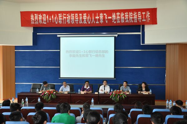 这次活动邀请了“1+1心联行动”总部的李扁主任,“1+1心联小屋”的资助人、毛泽东主席的特型演员、著名企业家、中华慈善总会中国青少年艾滋病防治教育工程爱心大使、章飞一绝先生,“1+1心联行动”四川基地王进鑫主任及相关领导到校交流和指导心理健康教育工作。这次活动旨在向5·12地震后给予我院心理援助和关爱的爱心人士表达感激之情,展现我院“1+1心联小屋”在灾后心理重建中取得的成绩。