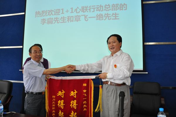 在交流会中,学院院长助理王开淮对嘉宾们的到来表示了热烈欢迎,感谢他们对我院师生心理重建给予的无私援助,表达了全校师生的感恩之情,并介绍了我院包括心理健康教育在内的灾后重建取得的突出成效;“1+1心联行动”总部李扁主任做了讲话;接下来,章飞一绝先生做了主题为“做一名有孝心、爱心和善心的大学生”的精彩演讲,获得了与会嘉宾和数百名师生的高度赞赏,赢得了经久不息的掌声;最后,党委副书记黄天贵教授代表学院向章飞一绝先生和“1+1心联行动”总部赠送锦旗。整个活动在愉快、融洽的氛围中落下了帷幕。