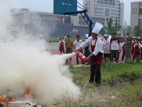 5月11日下午,学院“2012紧急逃生避险疏散演练活动”后,生活服务处组织学院食堂和超市职工50多人,在学院篮球场边的空地上进行了消防培训并进行了消防灭火实战演练。