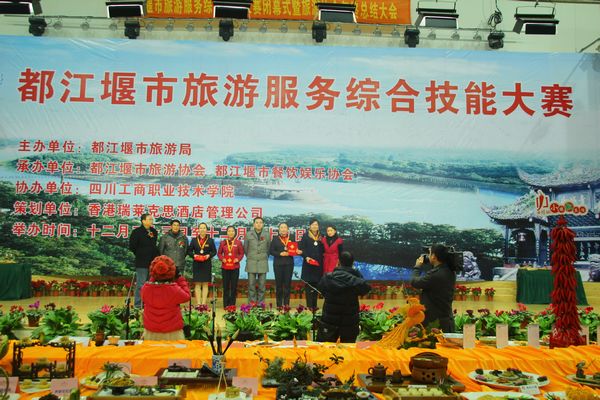 2011年12月29日下午的四川工商职业技术学院素质拓展馆彩球高悬、热闹非凡,为期7天的都江堰市旅游服务综合技能大赛在这里举行隆重的闭幕式。由我院协办的本次大赛,吸引了来自都江堰市旅游服务行业的近5000名选手们分为前厅组、客房组、餐饮组、景区讲解组、厨师组,参与了客房服务、餐厅和前厅服务、景区讲解、酒店厨师厨艺等五个项目的激烈角逐,显示出该市旅游服务行业从业人员良好的技能水平。学院院长肖和平出席大赛闭幕式并为获奖选手颁奖。