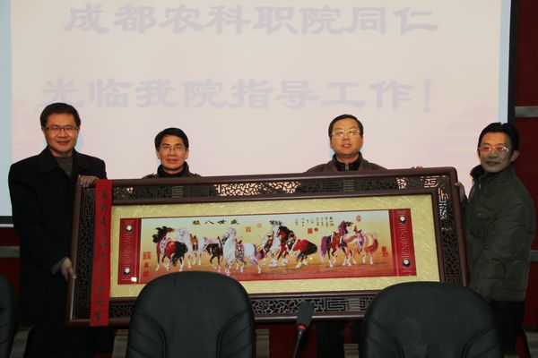 2012年12月29日,成都农业科技职业学院一行13人,在该院党委书记许亚东的带领下,来到我院参观访问。学院孙培生书记、肖和平院长以及学院领导班子、学院农科复学点部分负责人热情接待了来访的客人。