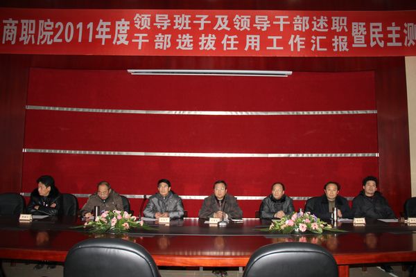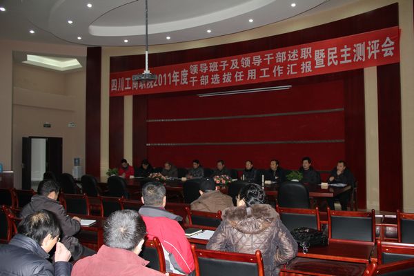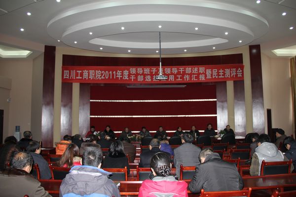 1月5日下午,学院在行政楼一楼会议室召开2011年度领导班子及领导干部述职、干部选拔任用工作汇报暨民主测评会。出席会议的有:全体院领导及中层以上干部、系主任助理、副高以上职称代表、民主党派、无党派、政协委员代表。大会由党委副书记、纪委书记黄天贵主持。