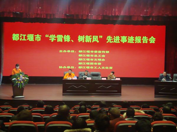 3月5日下午,财务11321班40名志愿者在财经系团总支书记冯宇菲老师的组织下,前往都江堰工人文化宫参加都江堰市“学雷锋、树新风”先进事迹报告会。
