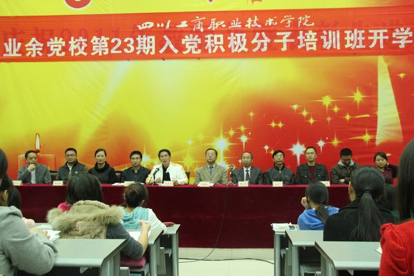 晚7时30分,学院业余党校第23期入党积极分子培训班开学典礼在学院演讲厅举行。党委书记孙培生、院长肖和平、副书记黄天贵及组织部负责人和各系党总支书记出席开学典礼,开学典礼由党委委员、组织部长王开淮同志主持。   在庄严的国歌之后,党委书记孙培生同志宣读了《中共四川工商职业技术学院委员会关于举办第二十三期入党积极分子培训班的安排意见》,并向全体学员提出了希望和要求。 随后,院长肖和平同志作了题为《肩负青年使命,勇于挑战、勇于创新》的主题讲话。肖院长指出,我们青年人面临的挑战前所未有,既有形势的挑战,也有理论的挑战和现实的挑战,我们应该担当起当代青年的使命,担当起历史的使命、政治的使命和成长的使命。讲话中,肖院长密切联系社会热点和学生实际,既有理论高度,又通俗易懂,娓娓道来,得到了同学们的积极响应。  随后,学员代表赵洁同学作了发言,表达了对党的热爱和加入党组织的强烈愿望,并表示时刻以党员的标准严格要求自己,争取早日加入党组织。