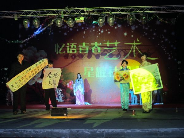 在接下来的社团文艺晚会更是异彩纷呈,缤纷多姿。有宛转悠扬的明月几时有,有优雅大方的T台秀,有别具风味的异域风情,有柔美多姿的现代舞蹈。活力四射的街舞,铿锵有力的武术表演,一次又一次将晚会推向高潮。