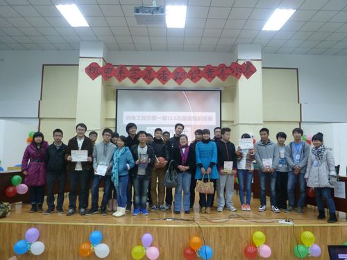 参赛的六个组分别来自机电系大一的学生。比赛围绕与志愿者活动相关的知识展开,分为抢答,选答、必答等三个环节。在每一个环节中,台上的参赛者积极参与,台下的观众呐喊助威,整个赛场充充斥着紧张、激烈的气氛,最后经评审小组打分,机电12320班以绝对的优势赢得第一名。