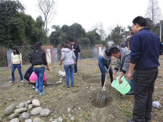 在志愿部的带领下,活动有序地进行着,同学们分工合作,积极参与,大家干劲冲天,劳动情趣高涨,不管男生还是女生,他们都很认真的对待这次活动,尽管那片土地的地质有一点硬,树坑很难挖,但是没有一个人抱怨,很多男生因为帮忙挖树坑手都磨出了水泡,他们依然觉得很开心。