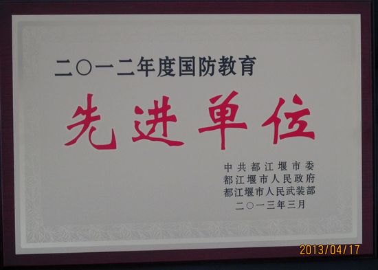 此前,在都江堰市委礼堂召开的全市2013年武装工作暨2012年武装工作总结表彰大会,我院武装部副部长杨敬东参加了会议。会上,市武装部部长熊中茂对2012年全市武装工作进行了全面总结,并就2013年全市武装工作进行了安排部署,市武装部政委苏小龙宣读了2012年度武装工作先进单位和先进个人的表彰决定。我院被授予都江堰市“国防教育先进单位”称号。