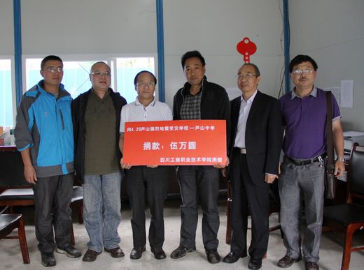 5月17日,学院副厅级调研员李肇全、副书记黄天贵、招生办公室主任夏光明一行专程前往雅安市芦山中学慰问该校师生,并代表全院师生将“4.20”地震赈灾募捐所得的伍万元善款,定向捐赠给芦山中学。雅安市招办主任杨学武、芦山中学校长杨元明、副校长罗国锋等接待了我院一行。黄天贵副书记在简短的捐赠仪式上表示,长期以来两所学校就有着联系与友谊,芦山强震让遭受过汶川大地震的我院师生感同身受,学院愿意将灾后恢复重建的经验与芦中一起分享,相信涅槃重生的芦山中学明天会美好。