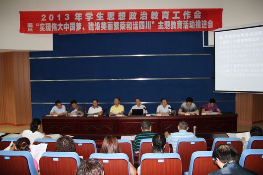 5月25日下午,学院在学术报告厅召开2013年学生思想政治教育工作会暨“实现伟大中国梦、建设美丽繁荣和谐四川”主题教育活动推进会。全院中层以上干部、全体专兼职辅导员、思想政治理论课教师、党务学工部门全体同志参加会议,副院长徐时彬主持会议。