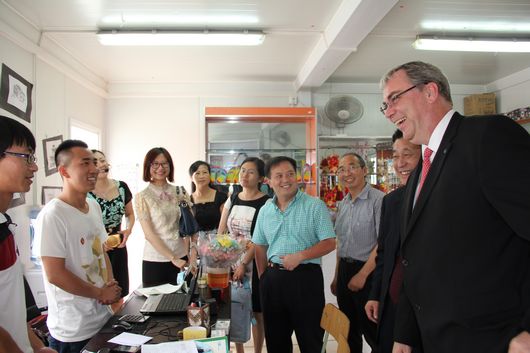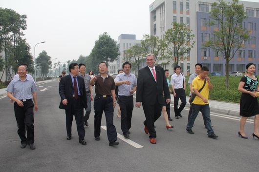 客人们首先参观了我院新校区,这是拜耳(中国)有限公司领导在我院新校区建成后第二次来访,对我院灾后重建取得的成就表示赞叹。2008年汶川大地震使我院遭受重创,64%的校舍无法使用,在我院面临学生安置、复课等一系列严峻问题的时候,拜耳集团及时伸出援助之手,向我院捐赠捐助了2010平方米的集装箱式聚胺脂板房,其中包括诊所1个、住房50间、教室20间,并在板房内配备了相应设施。在拜耳集团以及社会各界的帮助和关心下,我院师生的教学生活秩序得到了尽快的恢复。