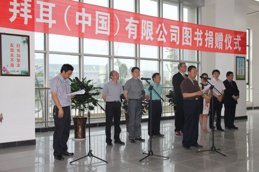 下午4时,拜耳(中国)有限公司图书捐赠仪式在学院图书馆大厅举行。学院党委孙培生书记、德国拜耳集团大中华区徳友汉总裁在捐赠仪式上先后致辞。孙培生书记对拜耳集团对学院抗震救灾和重建过程中给予的无私援助表示衷心的感谢,并高度评价了拜耳集团热心公益、勇于承担企业公民责任和义务的良好社会形象。徳友汉先生对学院能在短短时间重建美丽新校园表示钦佩,并祝愿同学们前程似锦、老师们桃李满天下、学院明天更美好。随后,徳友汉先生代表拜耳(中国)有限公司向我院捐赠五万元图书,孙培生书记代表学院接受了捐赠。
