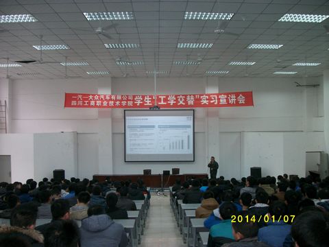 1月7日上午,我院在J1B演讲厅举行了一汽大众“工学交替”实习宣讲会。宣讲会由机电工程系主任顾元国主持,一汽大众成都人力资源部卢部长、就业中心负责人、机电系负责人、实习带队老师及机电系12级7个班级近300名学生参加了宣讲大会。