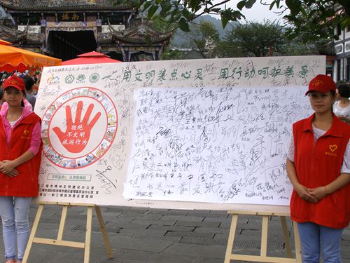 为扎实开展好国庆黄金周主题志愿服务活动,都江堰市文明办与学院党委宣传部(院文明办)进行了工作对接。党委宣传部在全院招募了40名志愿者,这批志愿者先后参加了都江堰市和学院的志愿者服务培训,并新建了“真情暖都江”QQ群。国庆的七天大假中,头戴小红帽、身穿红马褂的这批40名志愿者在分别在都江堰景区、玉垒山景区、古城区、客运中心、成灌高速路出口、一环路天燃气公司外侧街道等6个点位开展公共文明行为劝导和各类便民利民志愿服务活动,还开展了“拒接不文明旅游行为”签名和“都江堰我来了——我想对你说”留言等互动活动,成为都江堰市国庆黄金周的又一道风景线。